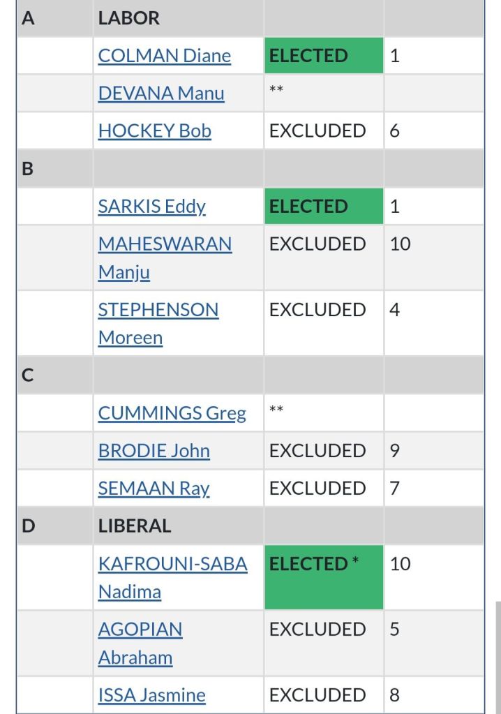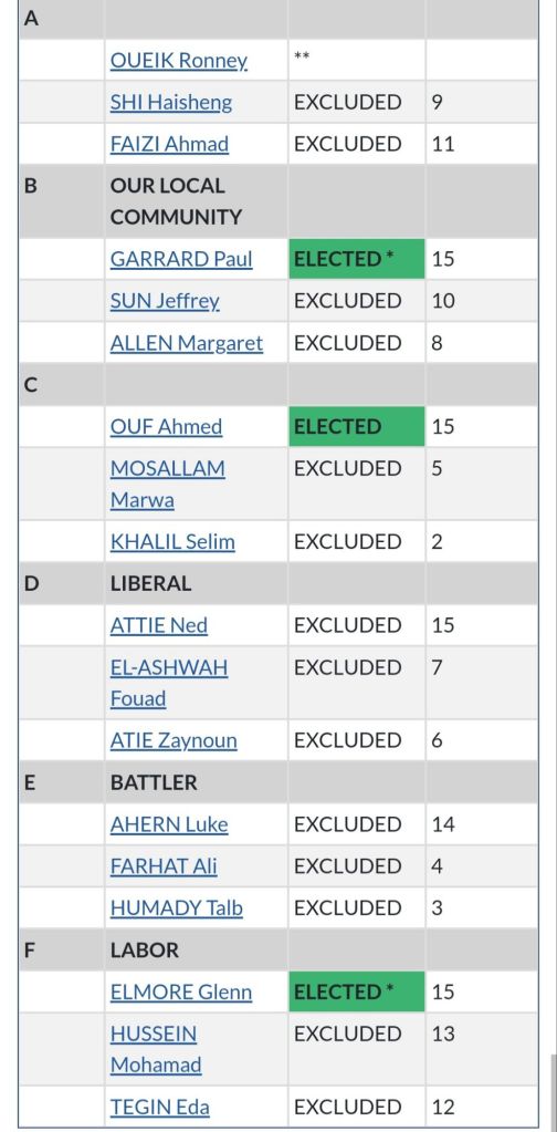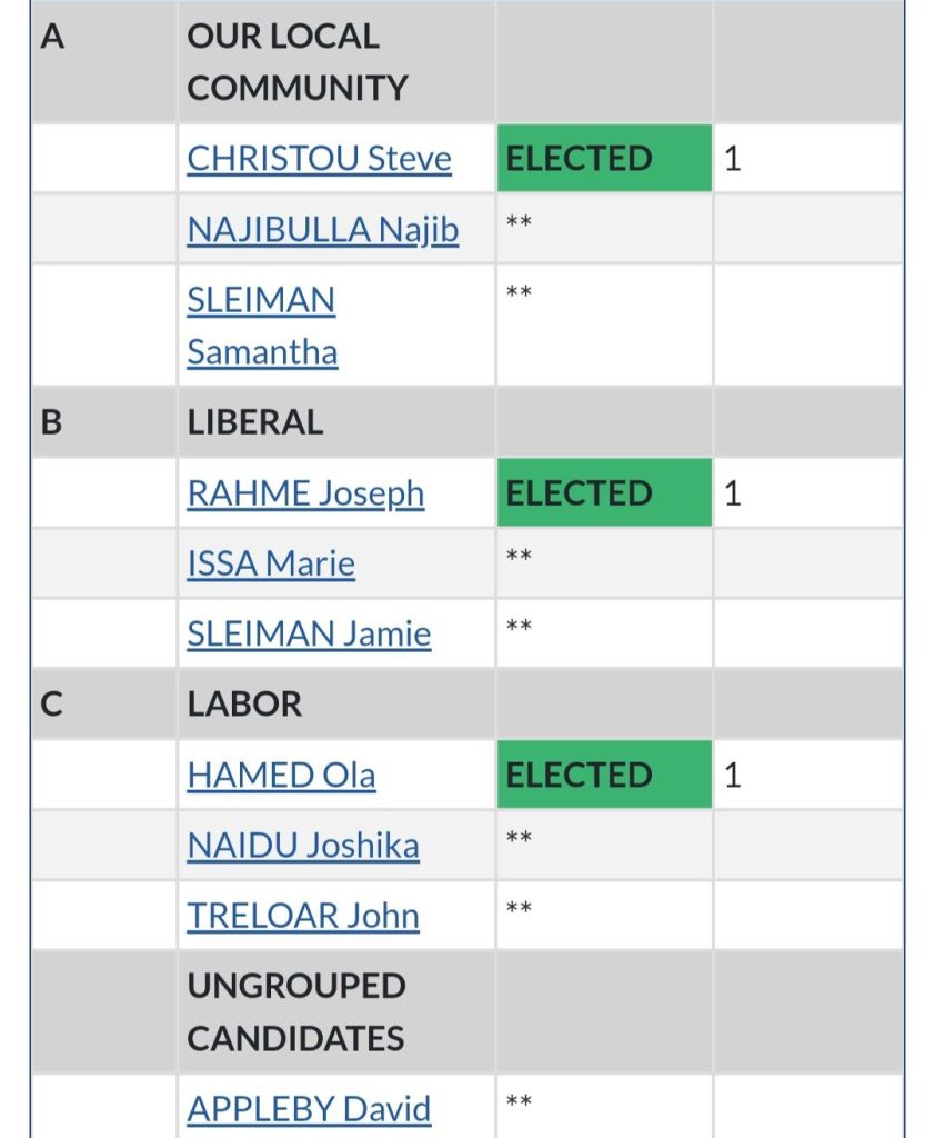 ایدی سرکس قبلاً نیز کنسولر بود، اما احمد اوف در نتیجه رقابت کمیونیتی علیه حزب کارگر بخاطر فلسطین در شورای شهر کمبرلند راه یافت. گفتنی است که از جامعه هزاره سه نفر، ایدا تگین از حزب کارگر در سوت گرنویل، نجیب الله نجیب از لوکال کمیونیتی در گرنویل و احمد فیضی در تکت رونی اویوک سرمایه دار منطقه در سوت گرنویل بود که هیچکدام راه نیافتند.