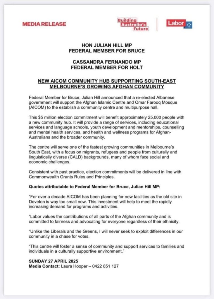 در تازهترین تحول، میدیا ریلیز بدست ما رسیده که جولیان هیل، نماینده فدرال حوزه بروس، و کاساندرا فرناندو، نماینده حوزه هولت از حزب کارگر، اعلام کردهاند که در صورت پیروزی مجدد دولت آلبانیزی، مبلغ ۵ میلیون دلار برای ایجاد یک مرکز اجتماعی و سالن چندمنظوره به جامعه افغانها اختصاص خواهد یافت. این پروژه با همکاری مرکز اسلامی افغانها و مسجد عمر فاروق (AICOM) اجرا خواهد شد و پیشبینی میشود که حدود ۲۵ هزار نفر از خدمات این مرکز بهرهمند شوند.