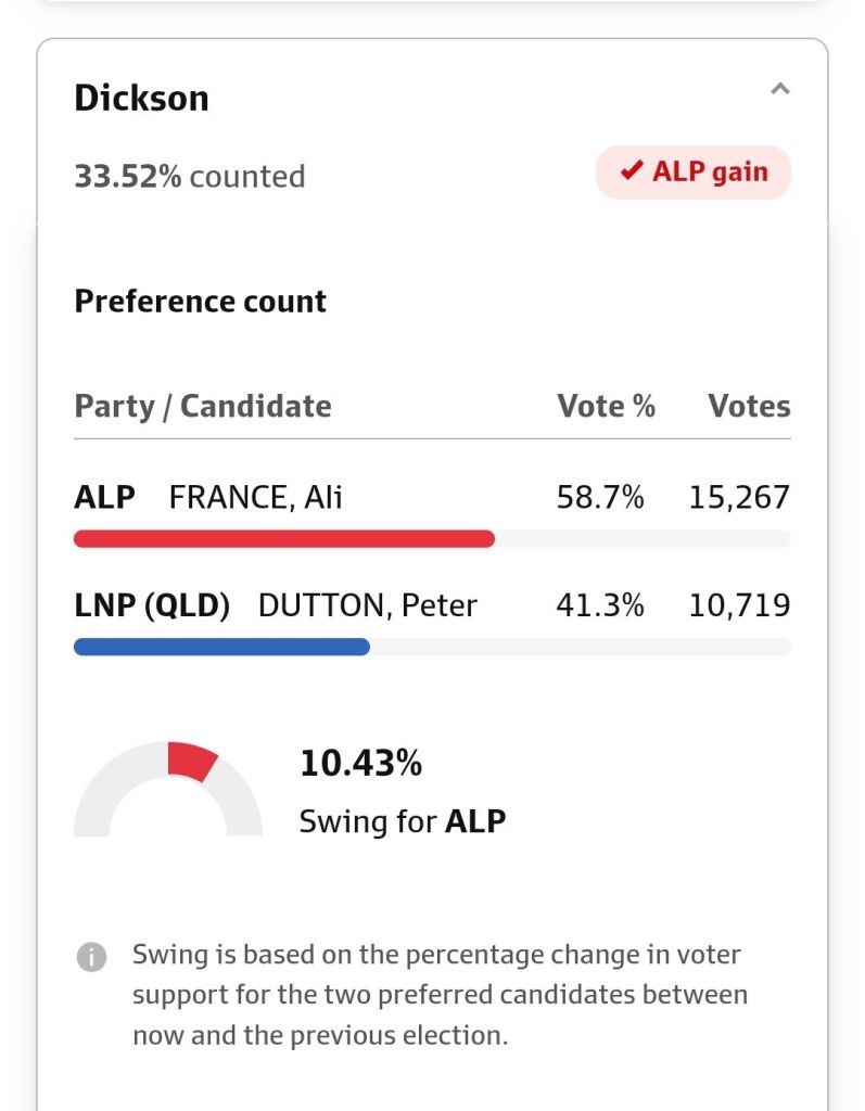 در انتخابات فدرال ۲۰۲۵ استرالیا، حزب کارگر به رهبری آنتونی آلبانیزی موفق شد برای دومین دوره پیاپی به پیروزی دست یابد و با کسب اکثریت قاطع در پارلمان، موقعیت سیاسی خود را تثبیت کند. این پیروزی در حالی بهدست آمد که ائتلاف محافظهکار لیبرال-نشنال به رهبری پیتر داتن با شکست کمسابقهای مواجه شد؛ بهگونهای که شخص داتن نیز کرسی خود در حوزهی انتخابیهی دیکسون را به رقیب حزب کارگر، علی فرانس، واگذار کرد.