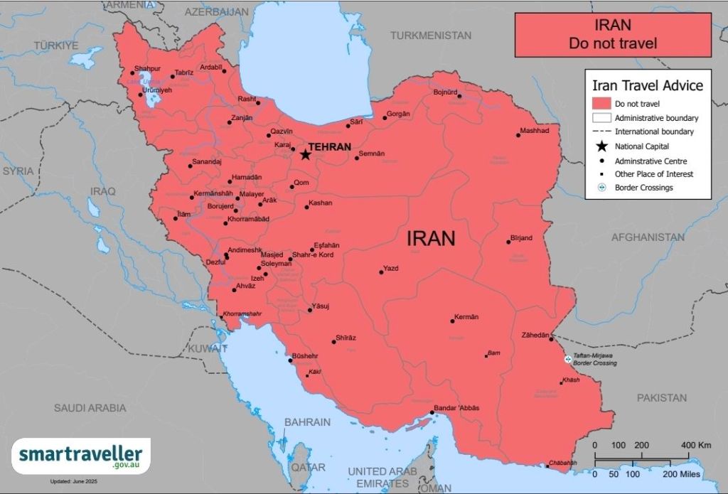 بر اساس اطلاعیه رسمی وبسایت Smartraveller، وابسته به وزارت امور خارجه و تجارت استرالیا، شرایط امنیتی در ایران «بهشدت ناپایدار» توصیف شده و خطرات جدی ناشی از اعتراضات گسترده، خشونت، بازداشتهای خودسرانه، تروریسم و محدودیت شدید خدمات کنسولی متوجه مسافران و شهروندان خارجی است.