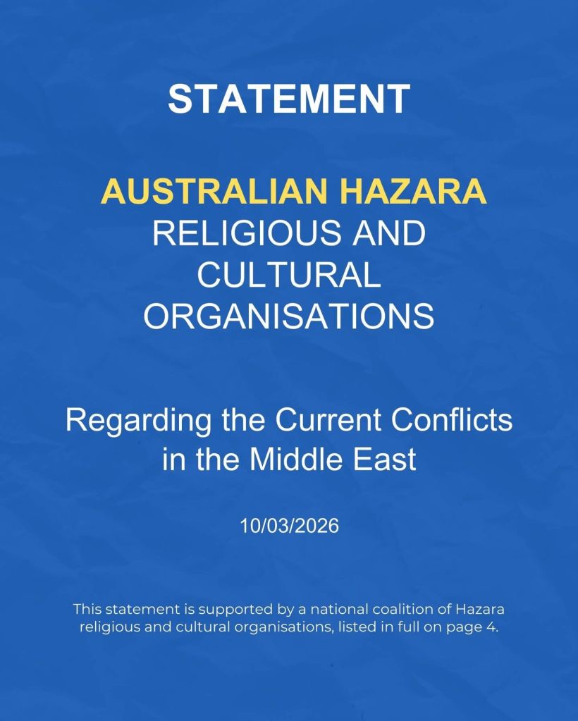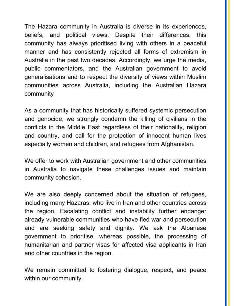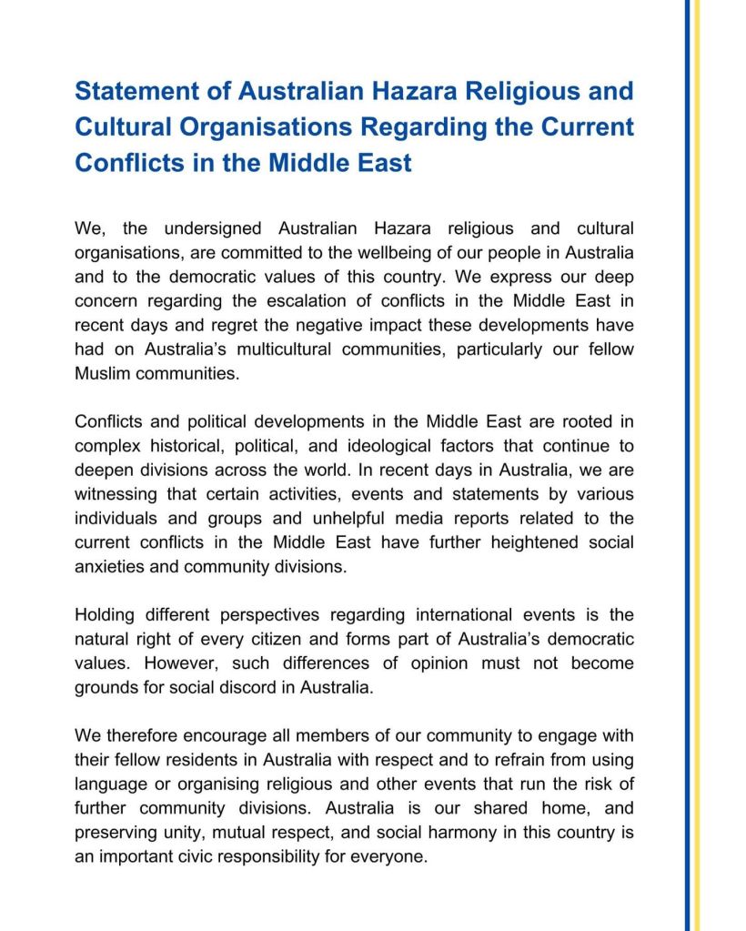 ما، سازمانهای فرهنگی و مذهبی جامعهٔ هزاره در استرالیا، بهعنوان امضاکنندگان این بیانیه، خود را متعهد به ارتقای رفاه و انسجام جامعهٔ هزاره و پاسداری از ارزشهای دموکراتیک استرالیا میدانیم. در این چارچوب، نگرانی عمیق خود را نسبت به تشدید درگیریها در خاورمیانه در روزهای اخیر ابراز داشته و از تأثیرات منفی این تحولات بر جوامع چندفرهنگی استرالیا، بهویژه جوامع مسلمان، ابراز تأسف میکنیم.