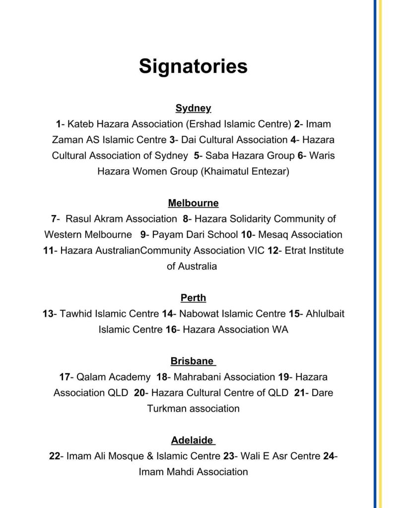 این بیانیه با حمایت ائتلافی ملی از سازمانهای مذهبی و فرهنگی هزاره در استرالیا صادر شده است که فهرست کامل آنها در پایین آمده است.